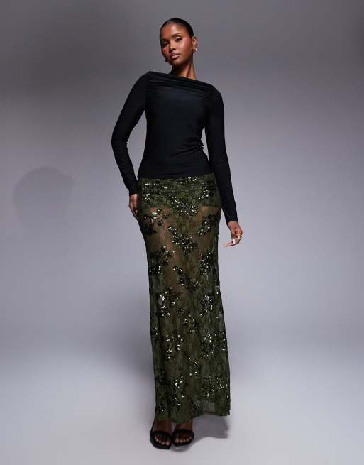 ASOS DESIGN - Doorschijnende maxi rok van kant met lovertjes in groen