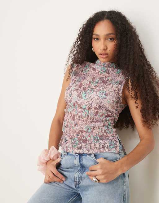 ASOS DESIGN - Doorschijnende tanktop van kant met print, hoge hals en aangerimpelde zijkant in roze