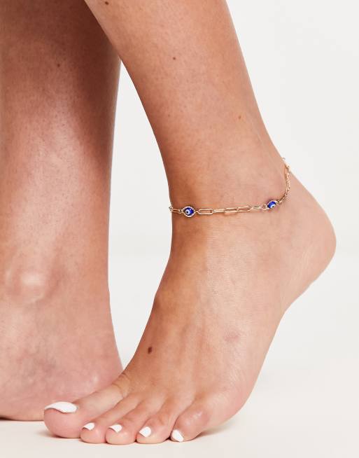 ASOS DESIGN - Enkelbandje met hangertjes van blauwe oogjes in goudkleur