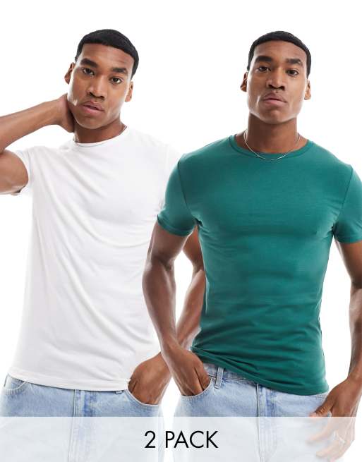 ASOS DESIGN - Essential - Set van 2 muscle fit T-shirts in donkergroen en wit