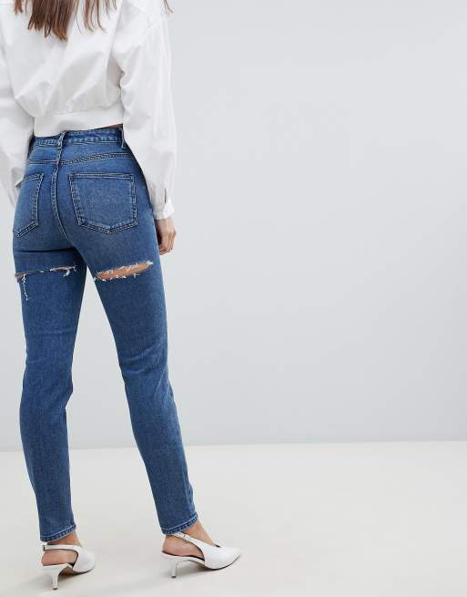 ASOS DESIGN - Farleigh - Smalle mom jeans met hoge taille in donkere stonewash met scheuren op de achterkant