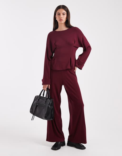ASOS DESIGN - Fijngebreide broek met wijde pijpen in donker kersenrood, deel van co-ord set