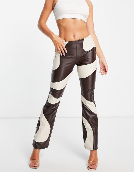 ASOS DESIGN - Flare-broek van imitatieleer met contrasterende wervelende vlakken in chocoladebruin en crème