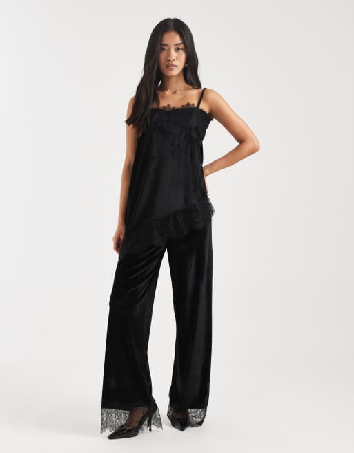 ASOS DESIGN - Fluwelen broek met halfhoge taille en kanten zoom in zwart, deel van co-ord set