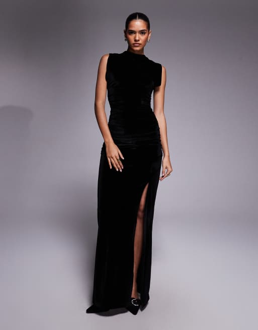 ASOS DESIGN - Fluwelen maxi-jurk met gerimpelde zijkanten en split in zwart