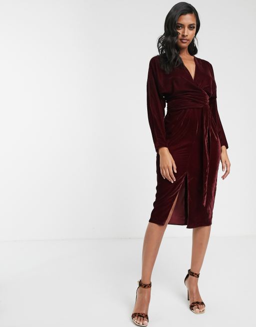 ASOS DESIGN - Fluwelen midi-jurk met vleermuismouwen en overslag