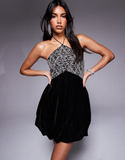 ASOS DESIGN - Fluwelen mini jurk met halternek, versiering en bolle zoom in zwart