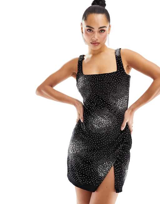 ASOS DESIGN - Fluwelen mini-jurk met lage ronde hals, cami-bandjes en versierde sterren in zwart