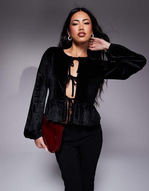 ASOS DESIGN - Fluwelen top met lange mouwen en gestrikte voorkant in zwart
