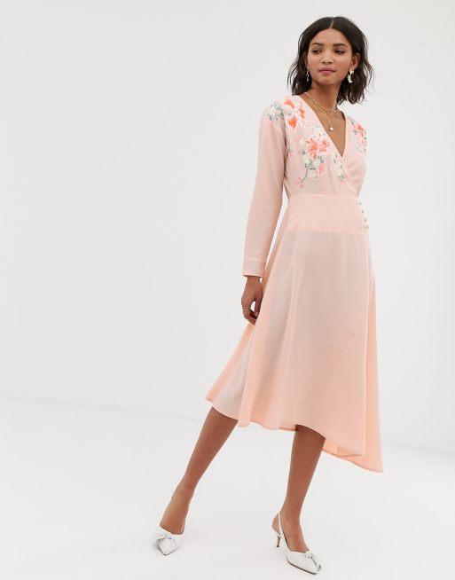 ASOS DESIGN - Geborduurde halflange wikkeljurk