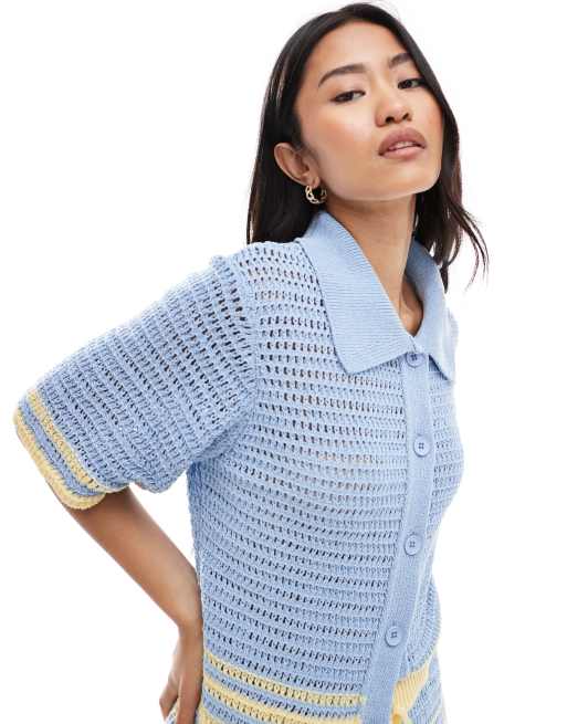 ASOS DESIGN - Gebreid gehaakt gestreept overhemd met schelpknopen in blauw en geel, deel van co-ord set