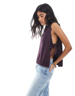 ASOS DESIGN - Gebreid hemdje met ronde hals en gestrikte zijkanten in pruimenpaars
