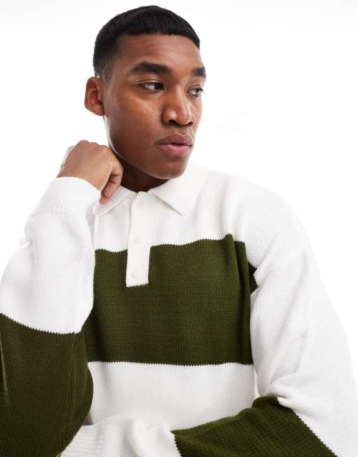 ASOS DESIGN - Gebreid, recht, ruimvallend, gestreept rugbyshirt in kaki en wit