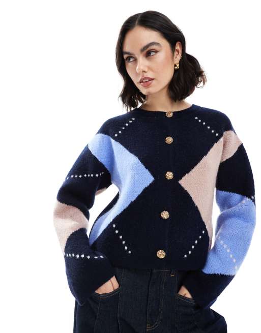 ASOS DESIGN - Gebreid vest met ronde hals, gouden knopen en Argyle-patroon in marineblauw
