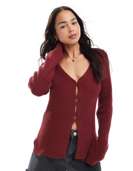 ASOS DESIGN - Gebreid vest met V-hals en gouden knopen in bordeauxrood