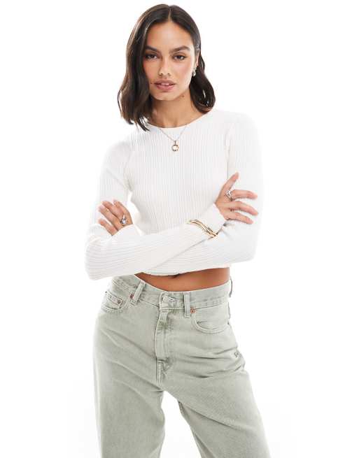ASOS DESIGN - Gebreide crop top met lange mouwen en ronde hals in wit