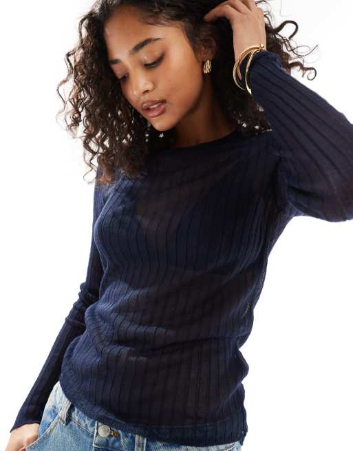 ASOS DESIGN - Gebreide doorschijnende top met ronde hals in marineblauw