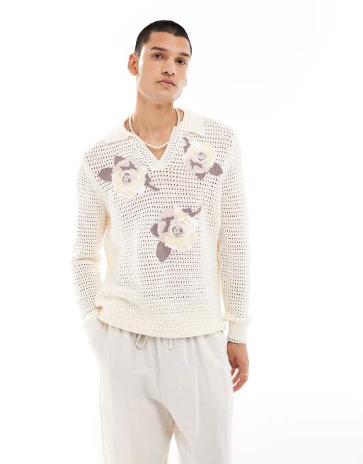 ASOS DESIGN - Gebreide gehaakte polo met inkeping aan de kraag en bloemenborduursels