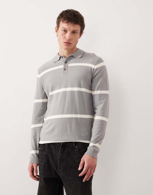 ASOS DESIGN - Gebreide gestreept polo met lange mouwen in grijs en ecru