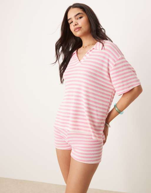 ASOS DESIGN - Gebreide gestreepte rugbytop met korte mouwen en kraagje in roze en wit, deel van co-ord set