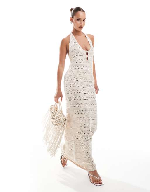 ASOS DESIGN - Gebreide maxi halterjurk in ecru
