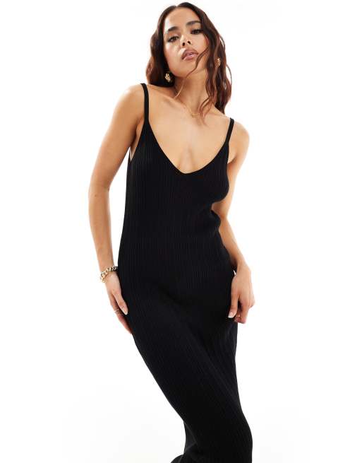 ASOS DESIGN - Gebreide midaxi jurk met V-hals en bandjes in zwart