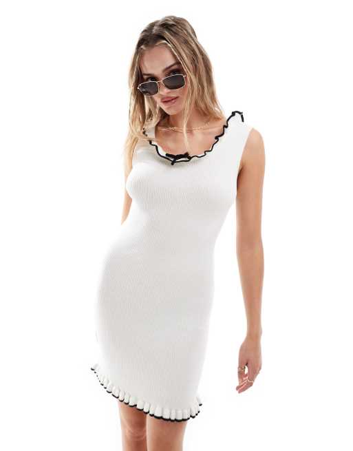 ASOS DESIGN - Gebreide mini-jurk met zwarte contrasterende biezen en gestrikt detail in crème