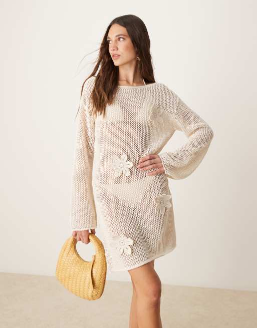 ASOS DESIGN - Gebreide mini strandjurk met 3D bloemen in ecru