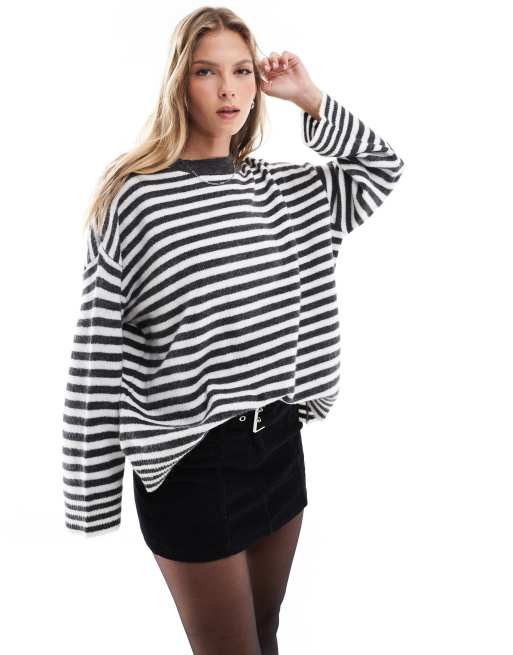 ASOS DESIGN - Gebreide pluizige oversized trui met strepen en ronde hals in antraciet