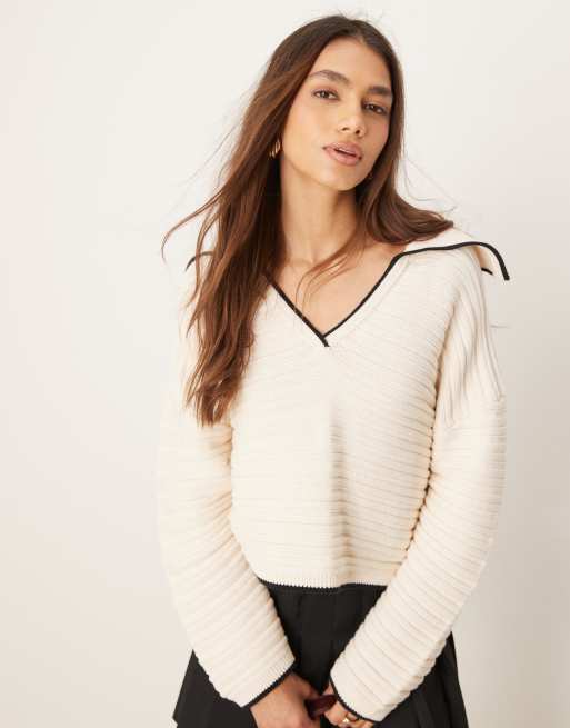 ASOS DESIGN - Gebreide trui met kraag en biezen in crème