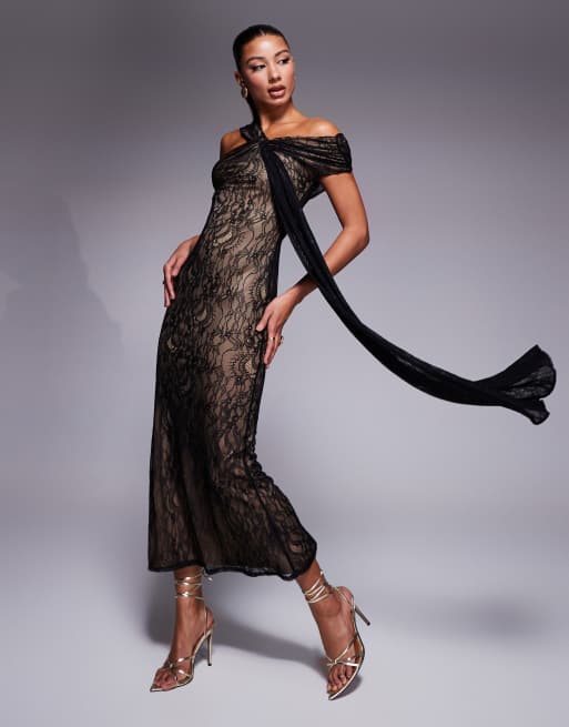 ASOS DESIGN - Gedraaide kanten midi-jurk met knoopdetail en contrasterende voering in zwart