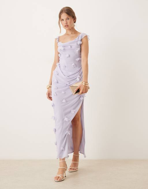 ASOS DESIGN - Gedrapeerde midaxi jurk met 3D bloemen, ruches en open achterkant in lila