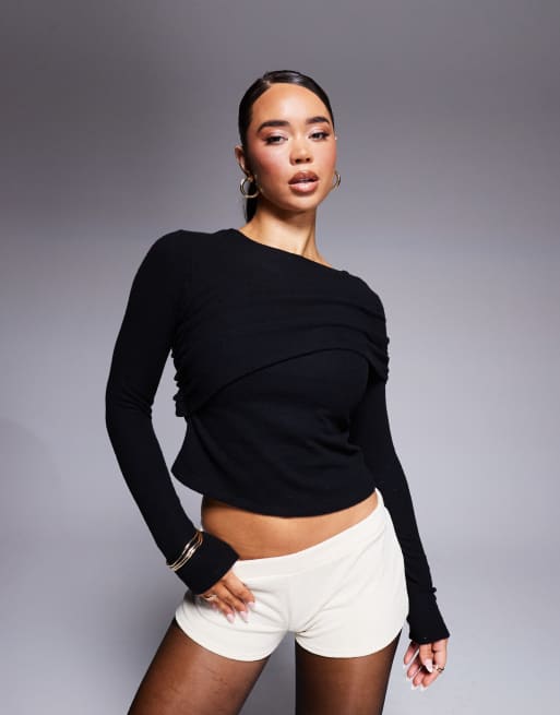 ASOS DESIGN - Gedrapeerde superzachte behaaglijke top met lange mouwen en rechte hals in zwart