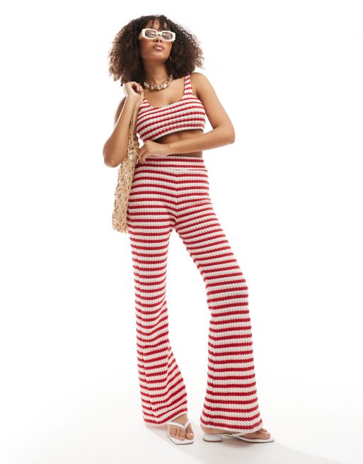 ASOS DESIGN - Gehaakte gestreepte smalle broek met wijde pijpen en textuur in rood en wit, deel van co-ord set