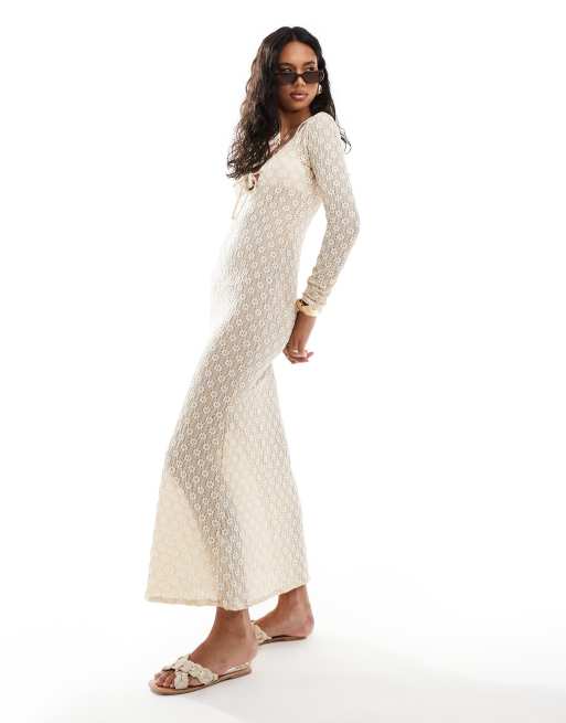 ASOS DESIGN - Gehaakte midaxi jurk met bloemmotief, gestrikte voorkant en lange mouwen in stone