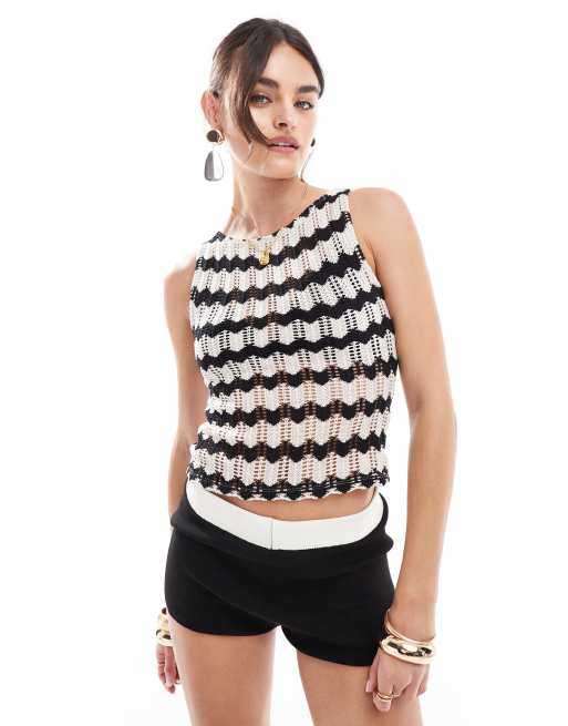 ASOS DESIGN - Gehaakte top met rechte hals en zigzagstrepen in zwart-wit