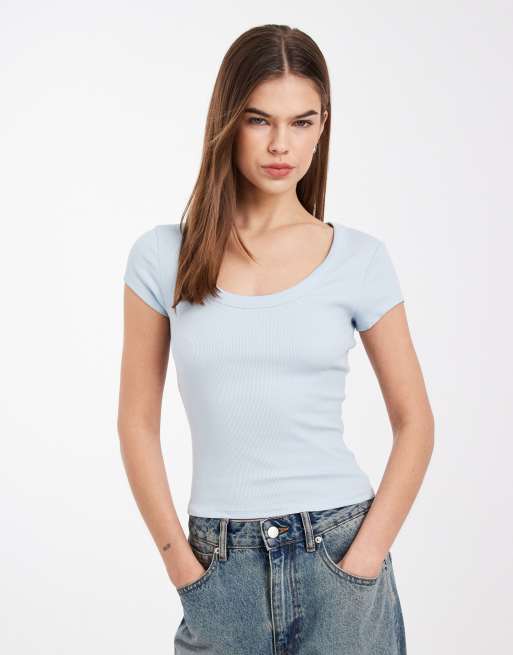 ASOS DESIGN - Gekrompen T-shirt met lage ronde hals in babyblauw