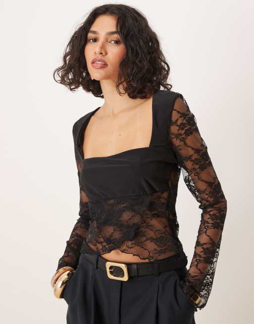 ASOS DESIGN - Gelaagde kanten top met vierkante hals en uitlopende mouwen in zwart