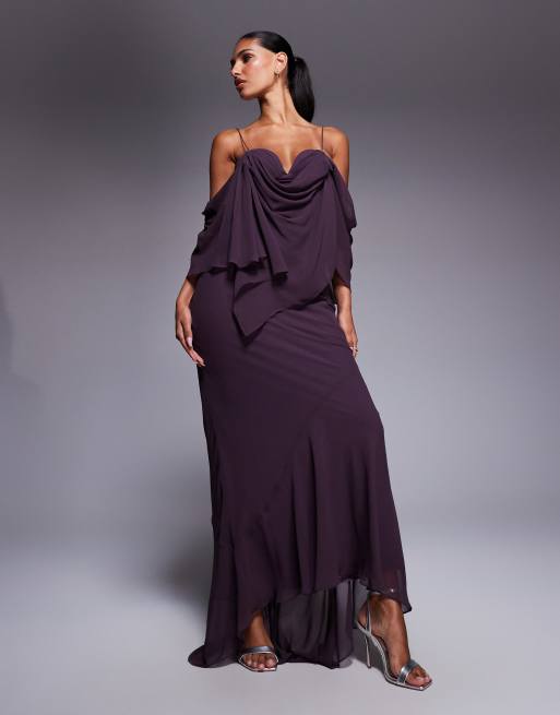 ASOS DESIGN - Gelaagde schuingesneden maxi jurk van chiffon met gedrapeerde buste en voorgevormde cups in pruimenpaars