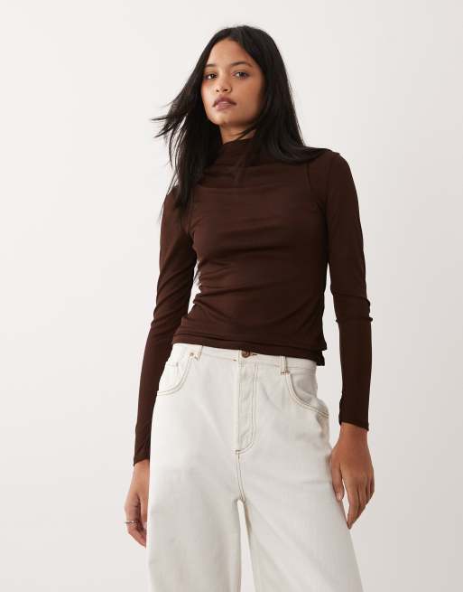 ASOS DESIGN - Gelaagde top met lange mouwen, opstaande boord en gerimpeld detail in chocoladebruin