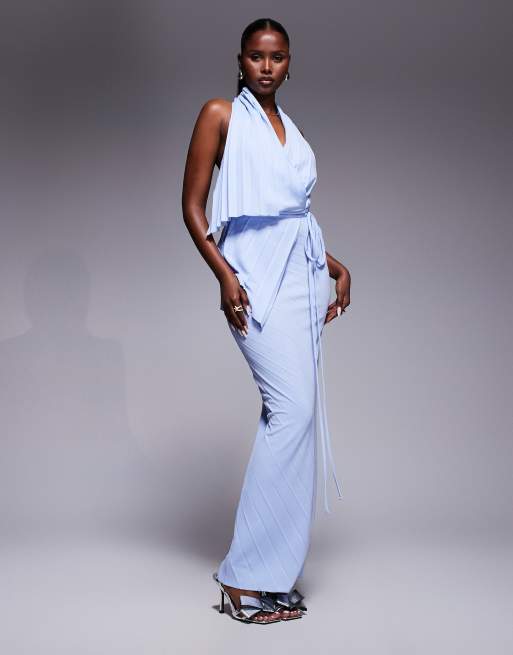 ASOS DESIGN - Geplooide diepuitgesneden maxi jurk met asymmetrische overslag in lichtblauw