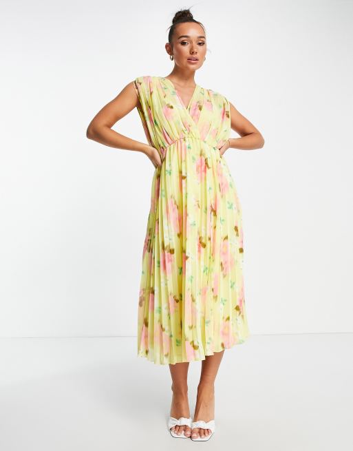 ASOS DESIGN - Geplooide midi jurk met overslag aan de voorkant in gele bloemenprint