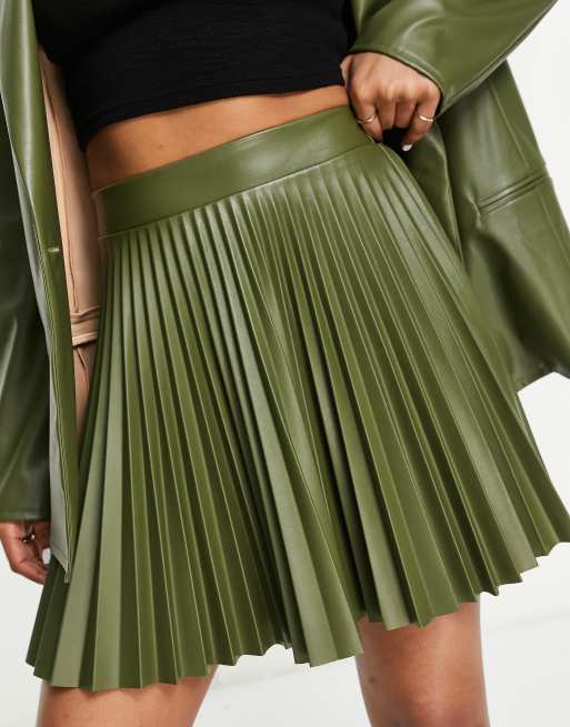 ASOS DESIGN - Geplooide nette minirok van jersey met leerlook in olijfgroen