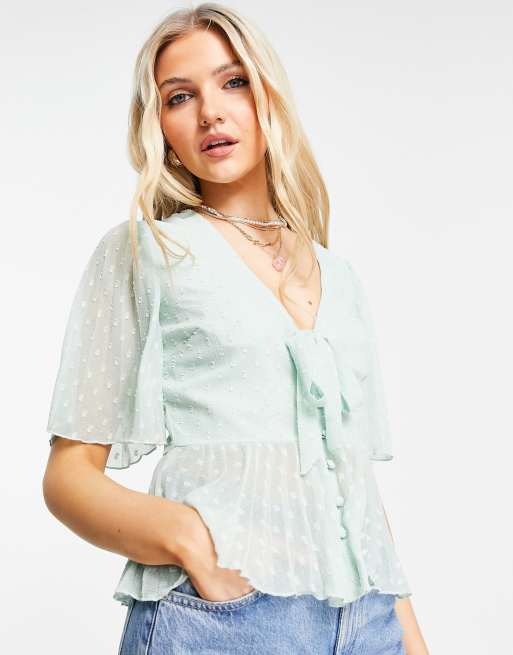 ASOS DESIGN - Geplooide peplum top met knoopjes en strik aan de voorkant in saliegroen