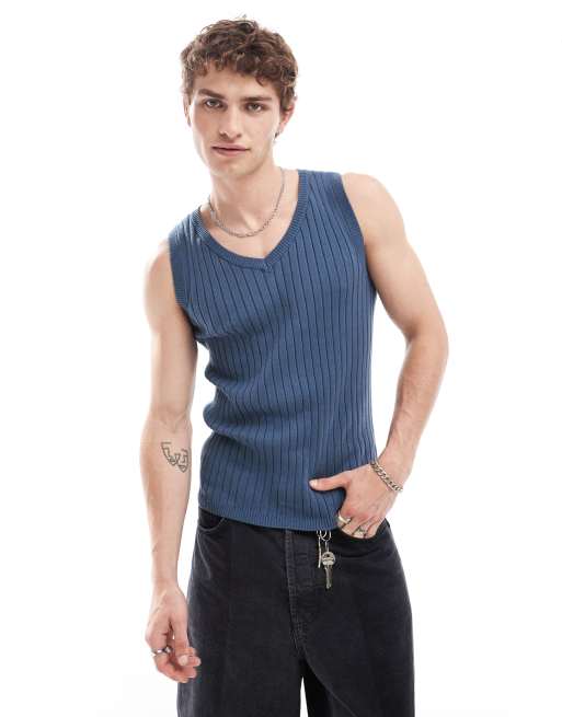 ASOS DESIGN - Geribbeld, lichtgewicht gebreid muscle fit hemdje met V-hals in marineblauw