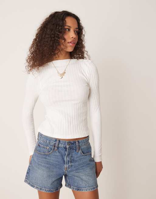ASOS DESIGN - Geribbeld T-shirt van slubstof met boothals, knopen en lange mouwen in crème