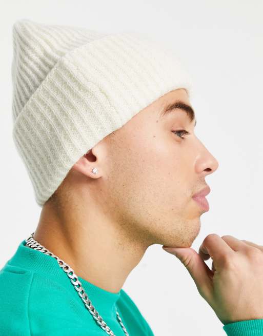 ASOS DESIGN - Geribbelde beanie van lamswol met brede omslag in ecru