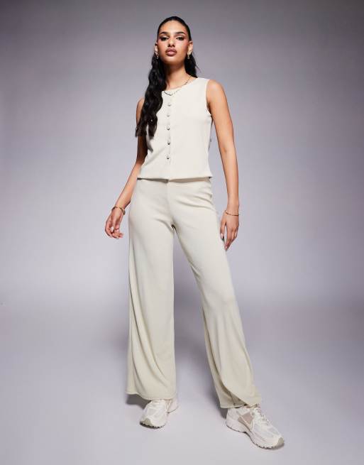 ASOS DESIGN - Geribbelde co-ord set met gilet met knopen aan de voorkant en broek met wijde pijpen in stone