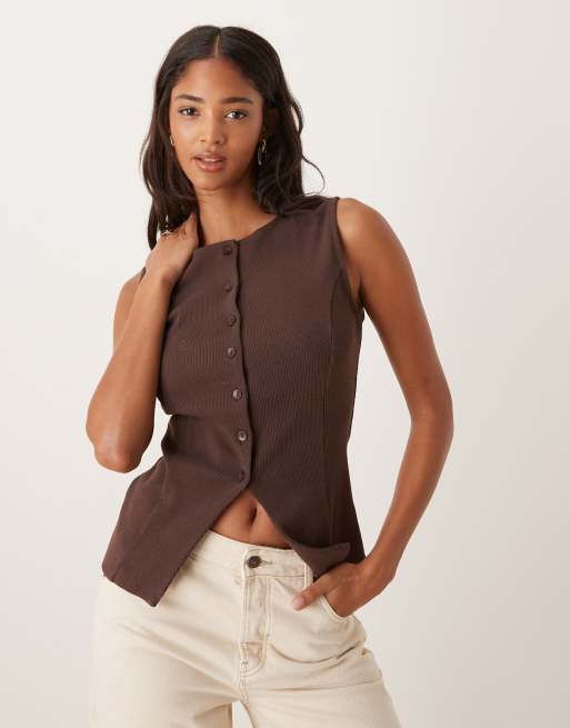 ASOS DESIGN - Geribbelde getailleerde top met lange pasvorm en knopen in bruin