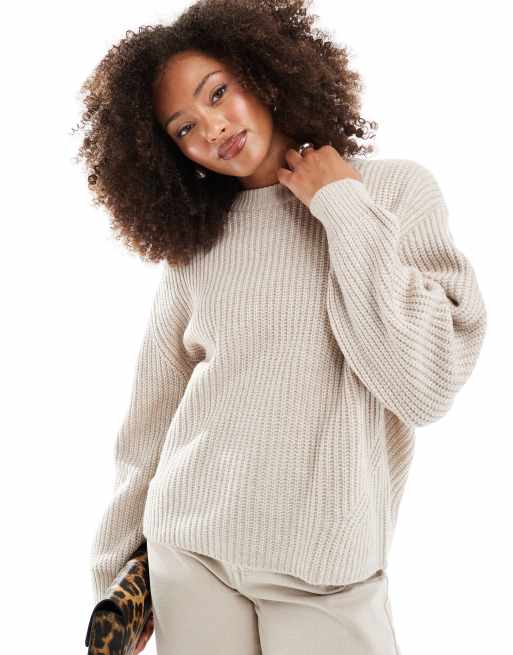 ASOS DESIGN - Geribbelde grofgebreide trui met ronde hals in lichtbeige
